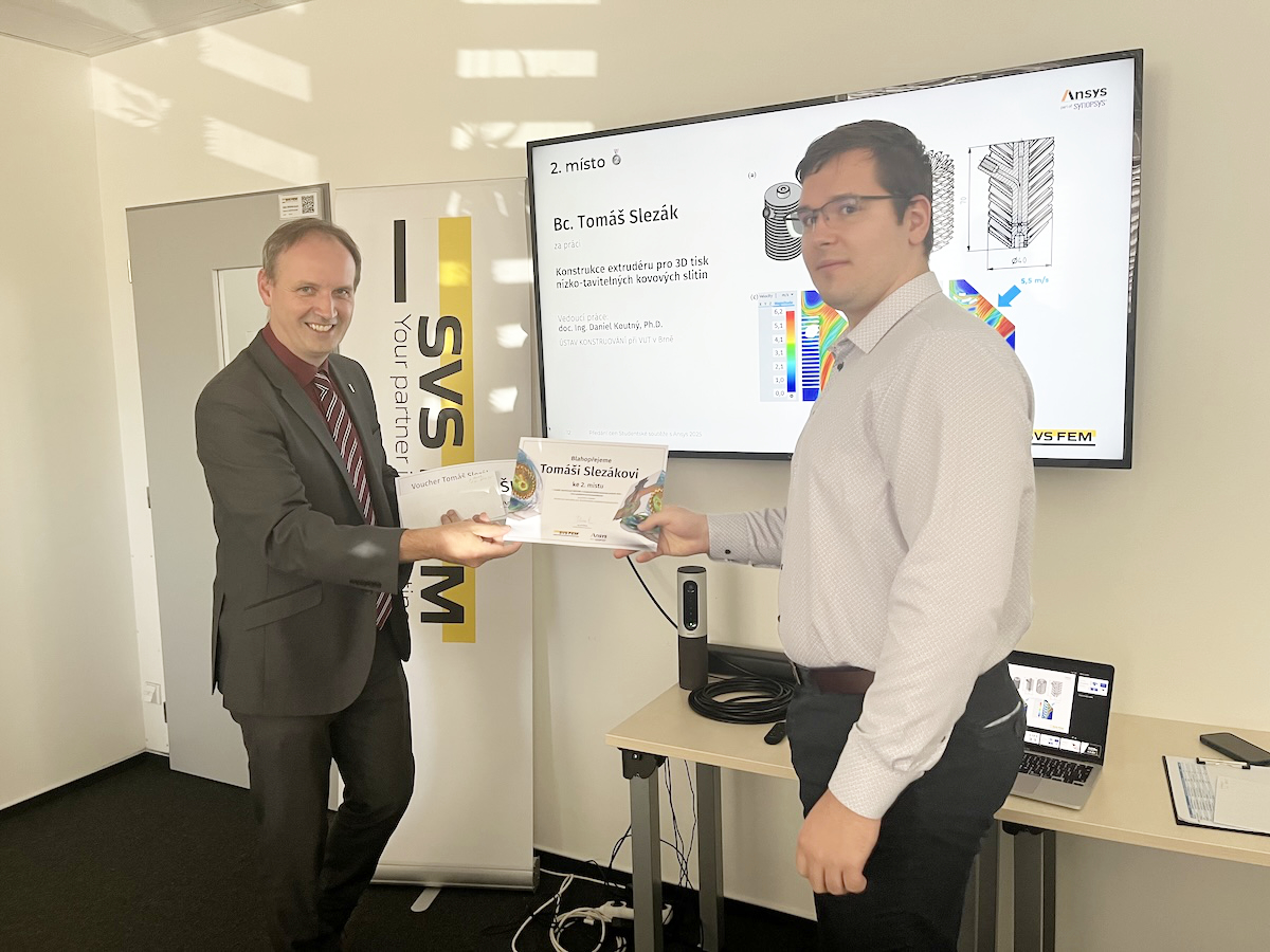David vyhrává 8 000 Kč + certifikované školení dle vlastního výběru pořádané naší společností. Pan Jiří Pospíšil jako vedoucí práce získává 2 000 Kč. David zaujal porotu především kombinovanou analýzou - elektromagnetická simulace + simulace proudění tekutin se zapojením více softwarů Ansys (Fluent a Maxwell). Zároveň se jednalo o praktickou práci řešící reálné zařízení. Hezká ukázka aplikovatelnosti numerických simulací v praxi.