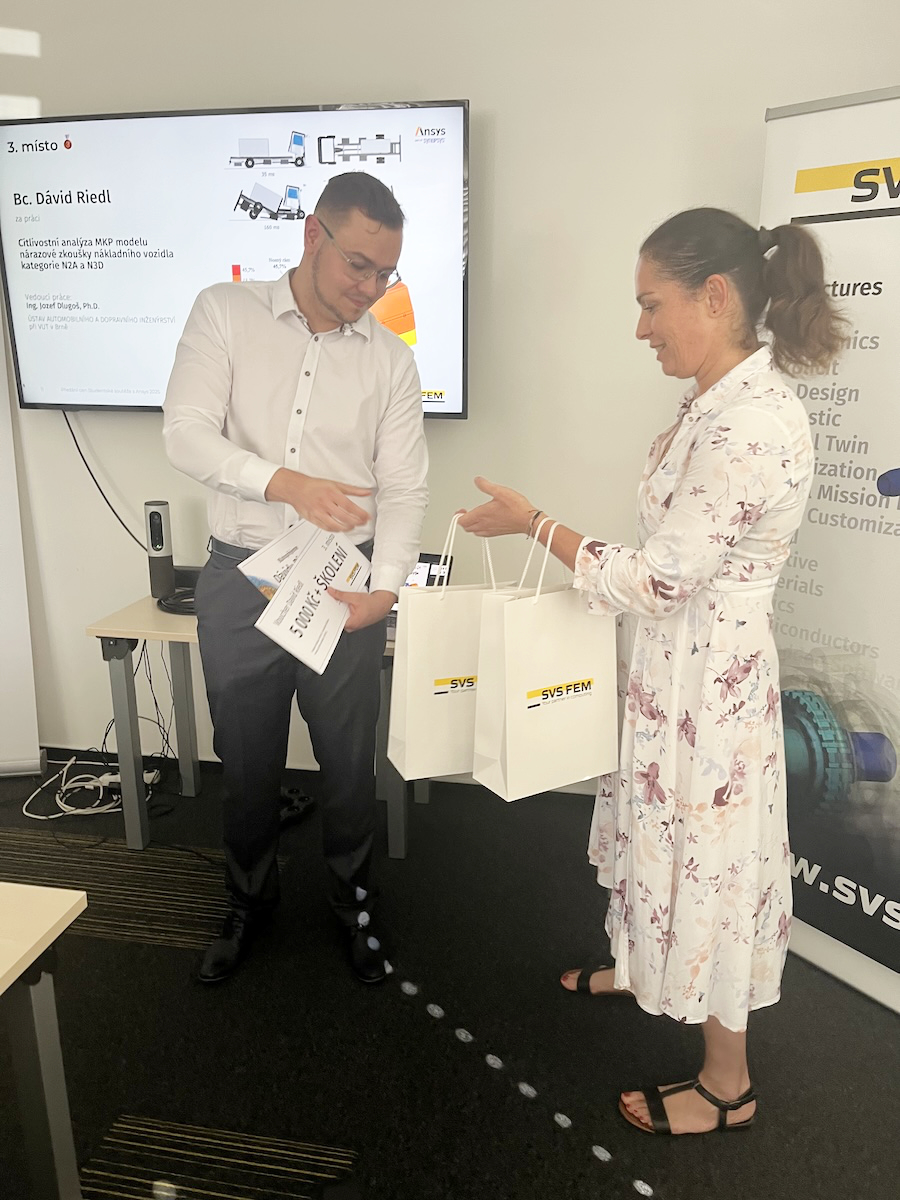 David získává 4 000 Kč + certifikované školení dle vlastního výběru pořádané naší společností. Pan Jozef Dlugoš jako vedoucí práce získává 1 000 Kč. David si získal plusové body poroty tím, že se ve své objemné práci věnoval jako jeden z mála rychlým rázovým dějům. Jednalo se o aplikaci simulací pro nárazy nákladních vozidel do bariér.